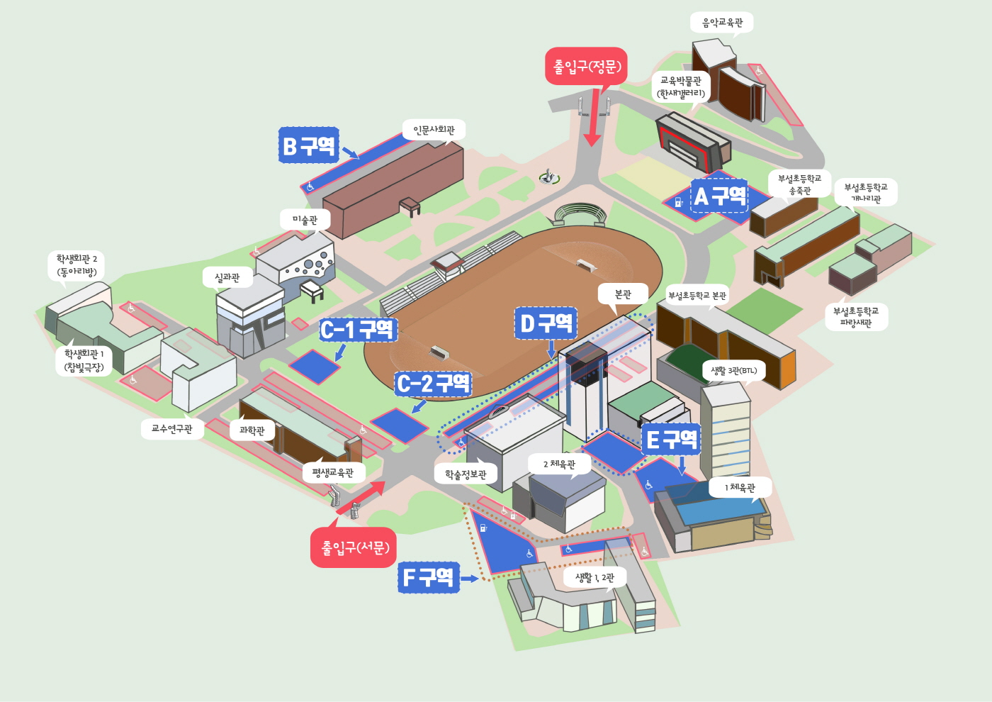 - 1층체육교육과 사무실, 경기장, 강의실, 교수연구실, 탈의실, 샤워실